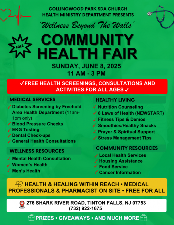 Welcome to the Collingwood Park SDA Church in Tinton Falls, NJ. We are a Christian Community Church and would love to meet you. To learn more about what we believe you can visit our About Us page. Please join us for Bible Study, worship, and prayer.